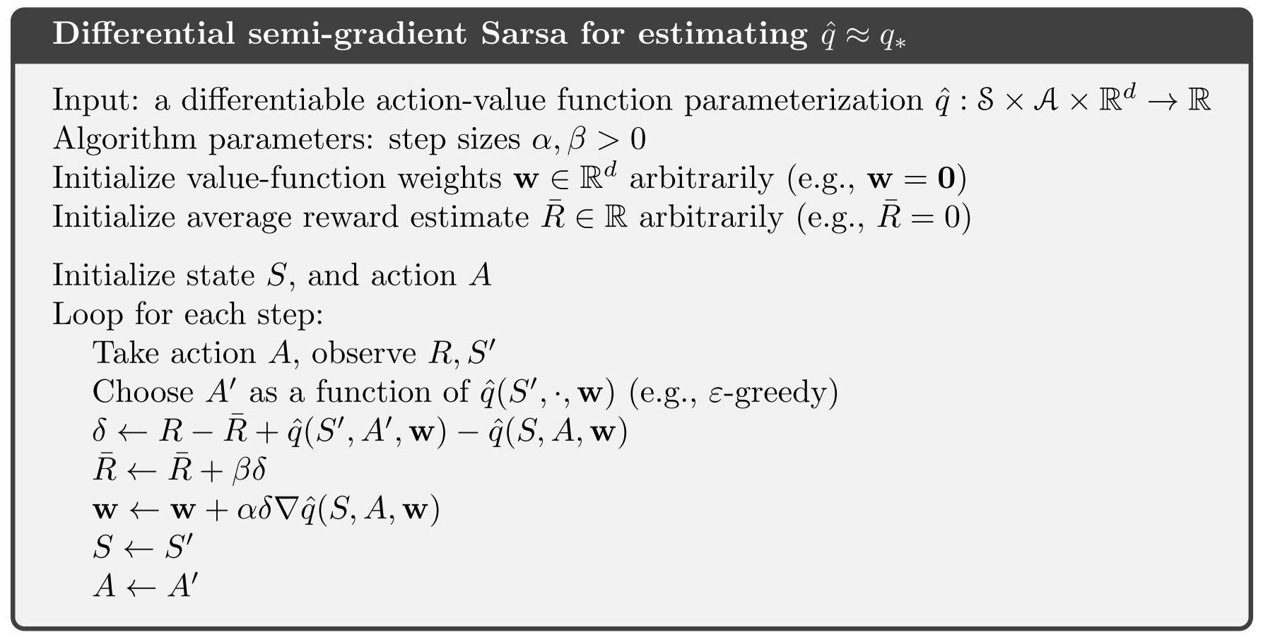 - 与 discounted setting 类似,average reward setting 也是不停止地与环境交互,用于没有开始、终止状态的连续型问题。
