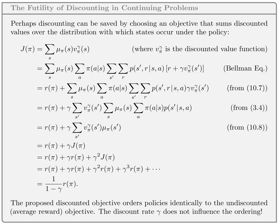 可以看出,在 on-policy 分布下,\(J(\pi)\) 和 \(r(\pi)\) 成正比关系,然而通过 \(r(\pi)\) 对策略优劣的排序结果是固定的,显然 \(J(\pi)\) 选出的策略顺序也相同,这说明削减系数 \(\gamma\) 对于决策选择行动没有实质性的影响,discounted setting 在这时便失去了一些使用价值,所以需要做出一些改变。