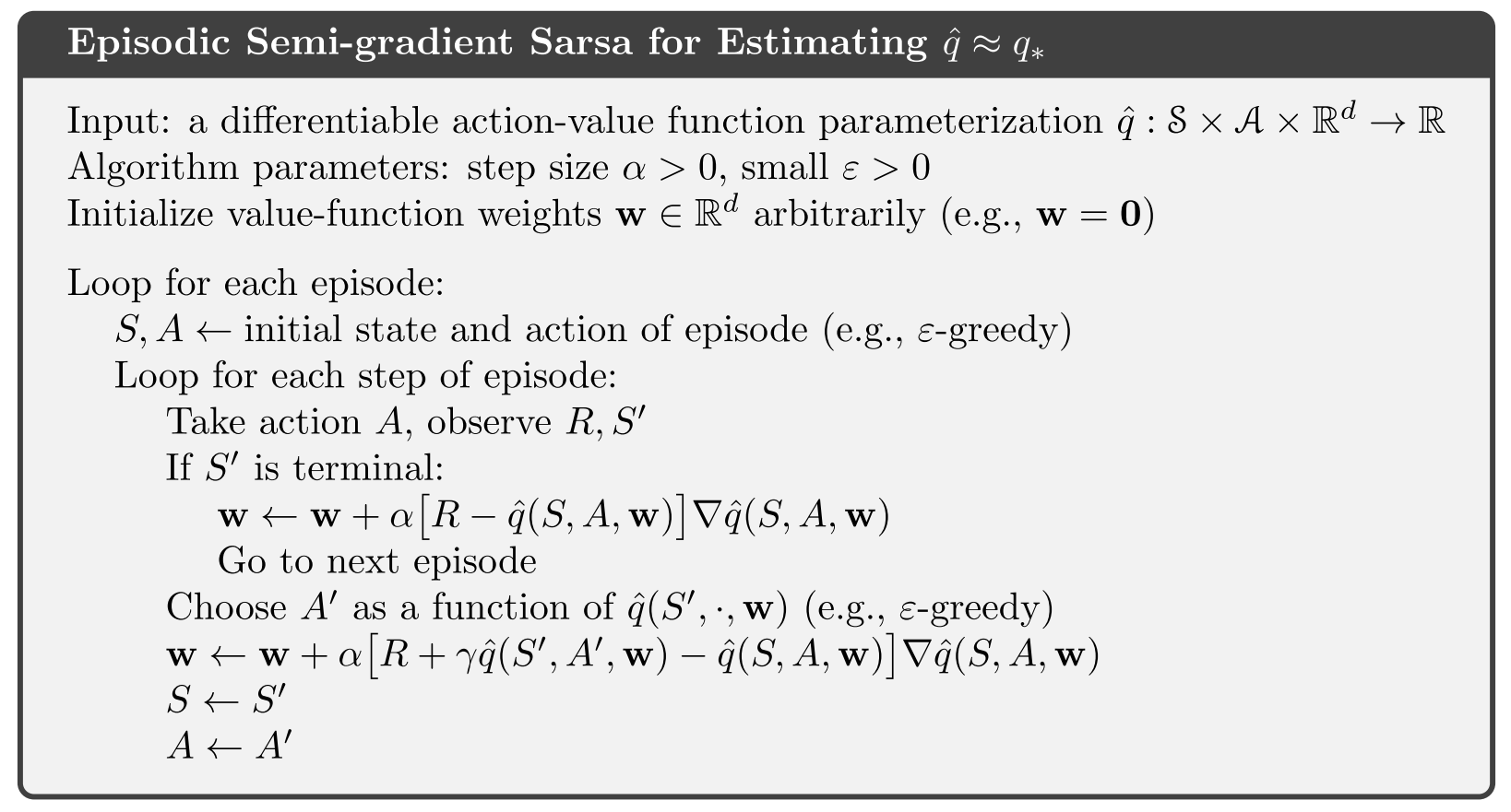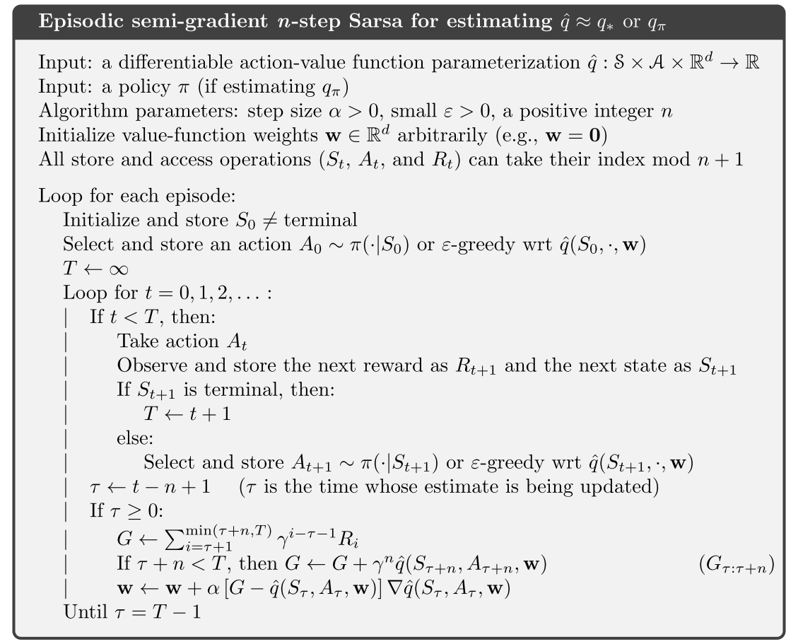 令 \(U_t=G_{t:t+n}\) ,即为 n-step semi-gradient sarsa 算法,其中