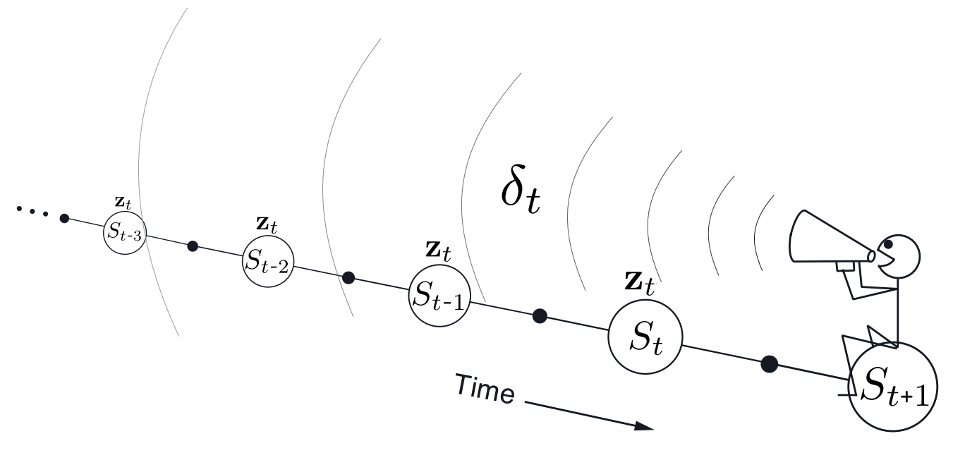 TD(\(\lambda\)) 是 backward 的,即,每个时刻得到新的 TD error 后,又依据它对之前 states 的 eligibility trace 作一些调整,如下面示意图所示。