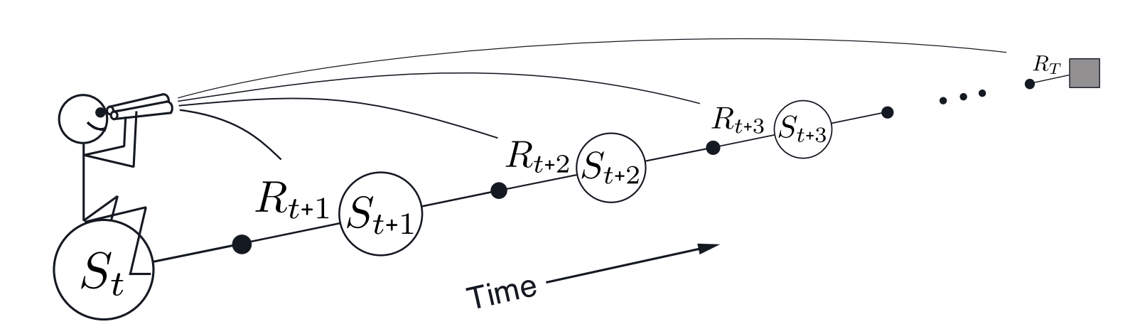 \[ \begin{aligned} G _ { t } & \doteq R _ { t + 1 } + \gamma _ { t + 1 } G _ { t + 1 } \\ & = R _ { t + 1 } + \gamma _ { t + 1 } R _ { t + 2 } + \gamma _ { t + 1 } \gamma _ { t + 2 } R _ { t + 3 } + \gamma _ { t + 1 } \gamma _ { t + 2 } \gamma _ { t + 3 } R _ { t + 4 } + \cdots \\ & = \sum _ { k = t } ^ { \infty } \left( \prod _ { i = t + 1 } ^ { k } \gamma _ { i } \right) R _ { k + 1 } \end{aligned} \]