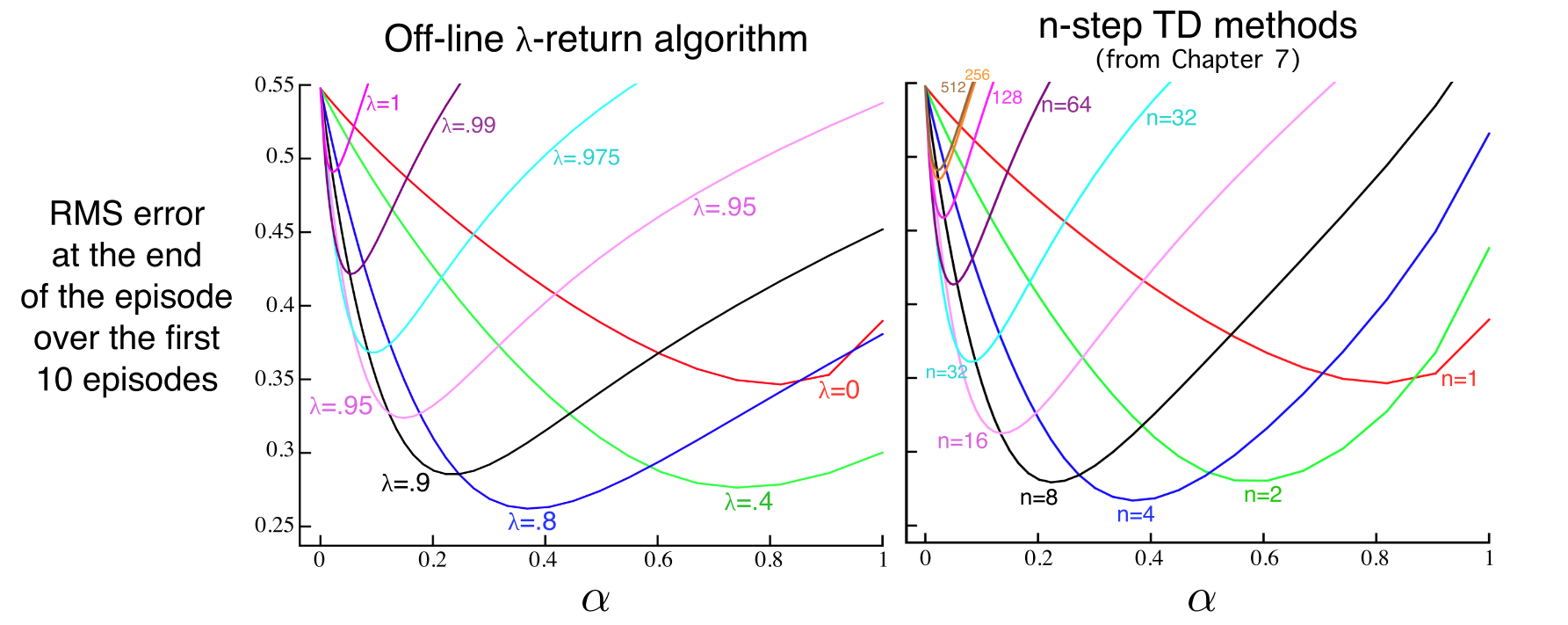 本例说明了 eligibility trace 并不局限于 TD 方法,只要想做长期预测,都可以采用 eligibility trace 。