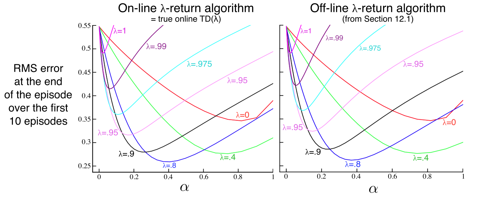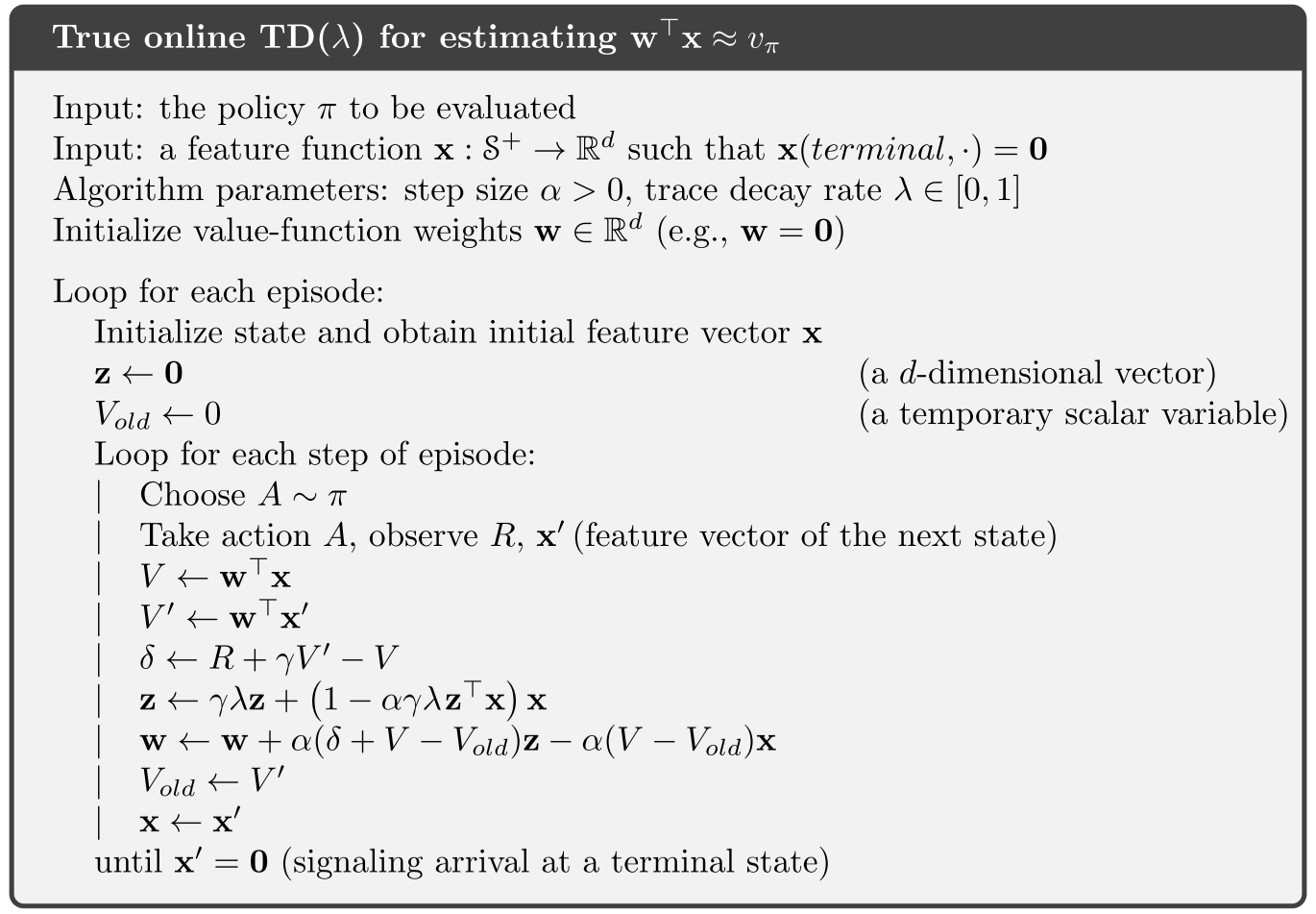 此算法可以产生和 online \(\lambda\)-return 算法一样的结果,空间要求和 TD(\(\lambda\)) 相同,计算量稍微增加了 50%,但仍为 \(O(d)\) 复杂度。