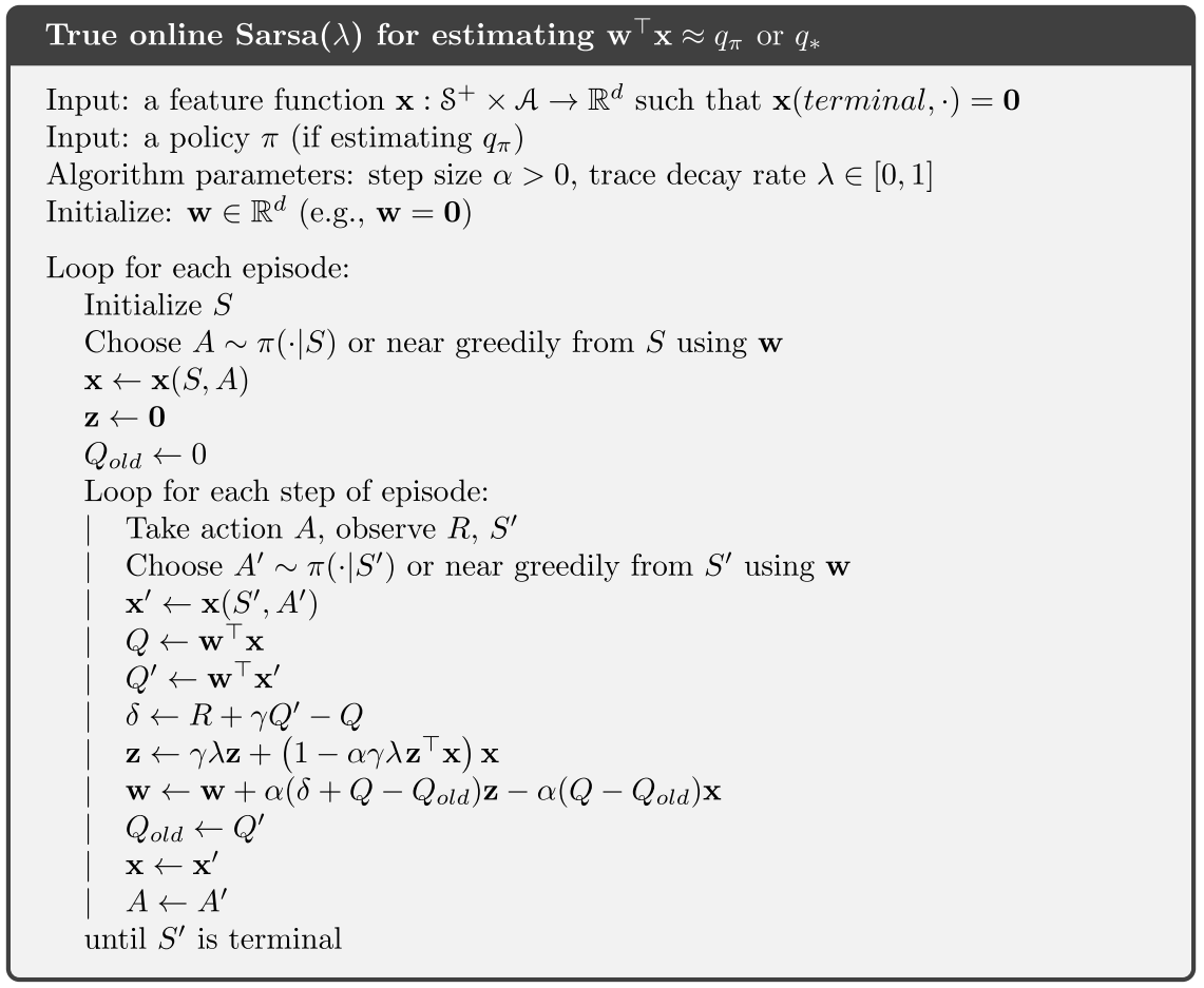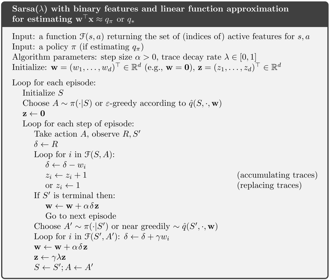 \[ \begin{array}{l} \mathbf { w } _ { t + 1 } \stackrel { \cdot } { = } \mathbf { w } _ { t } + \alpha \delta _ { t } \mathbf { z } _ { t }\\ \delta _ { t } \doteq R _ { t + 1 } + \gamma \hat { q } \left( S _ { t + 1 } , A _ { t + 1 } , \mathbf { w } _ { t } \right) - \hat { q } \left( S _ { t } , A _ { t } , \mathbf { w } _ { t } \right)\\ { \mathbf { z } _ { - 1 } \doteq \mathbf { 0 } } \\ { \mathbf { z } _ { t } \doteq \gamma \lambda \mathbf { z } _ { t - 1 } + \nabla \hat { q } \left( S _ { t } , A _ { t } , \mathbf { w } _ { t } \right) } \end{array} \]