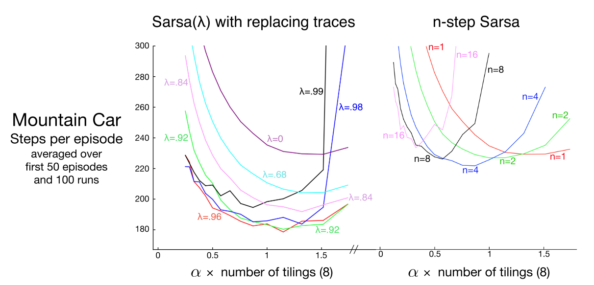 当 \(\lambda=0\) 时,trace 恰好就是 value function 的梯度,此时正好对应 1-step TD ;当 \(\lambda=1\) 时,可以看出每一个 state 都刚好衰减 \(\gamma\) 倍,跑完这个 episode ,恰好就是 MC 。可以看出,使用了 eligibility trace 后仍能统一地表示各种算法。