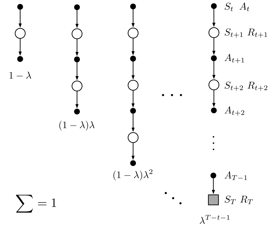 TD(\(\lambda\)) 也属于这种 averaging n-step update ,他包括了所有的 n-step updates,权重系数分别为 \(\lambda^{n-1}, \lambda\in[0,1]\),\(\lambda\)-return 定义如下(其中 \(1-\lambda\) 确保能归一化):