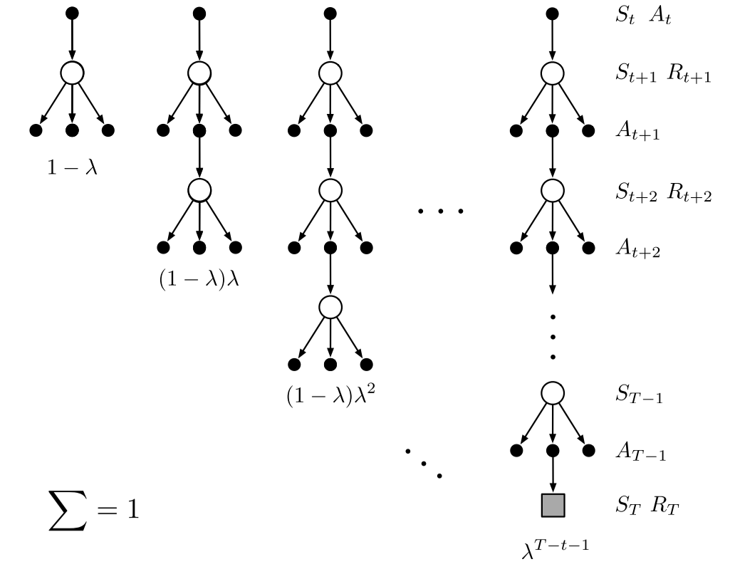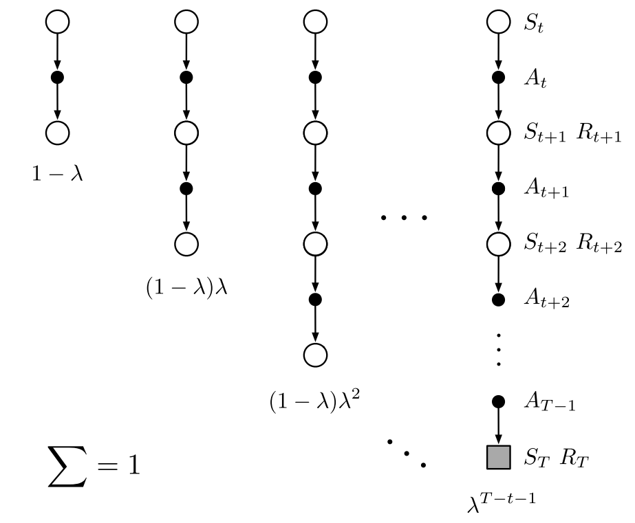观察可知,当 \(\lambda=1\) ,此方法为 MC;当 \(\lambda=0\) ,此方法为 1-step TD。