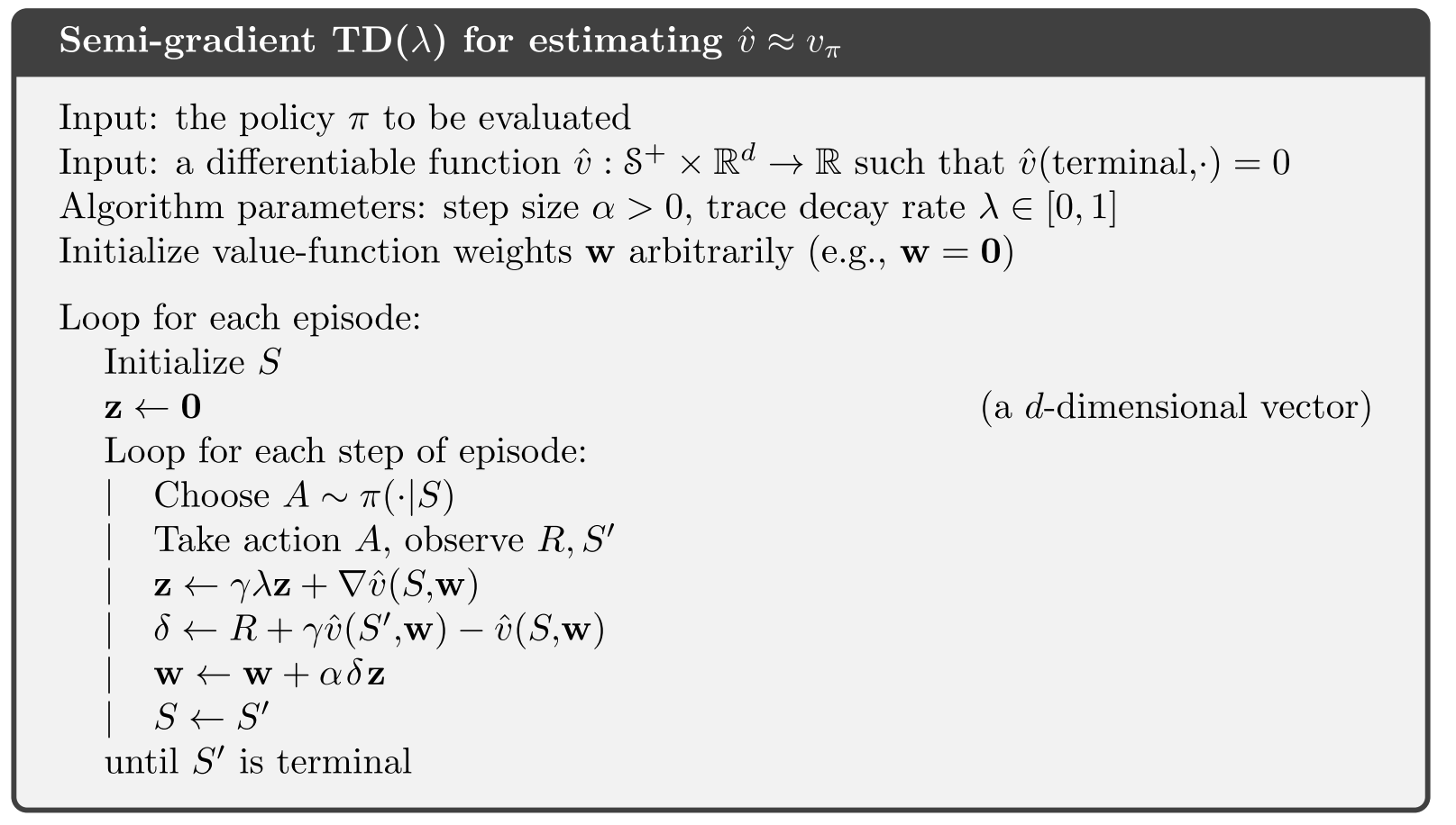 \[ \mathbf { w } _ { t + 1 } \doteq \mathbf { w } _ { t } + \alpha \delta _ { t }[\color{blue}{\nabla\hat{v}(S_t,\mathbf{w}_t)+\gamma\lambda\mathbf{z}_{t-1}}] \]