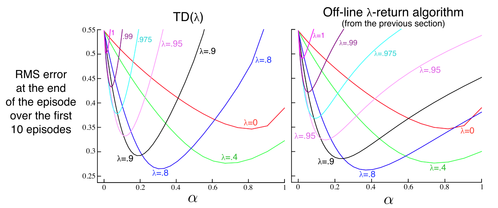 在 TD(\(\lambda\)) 方法中,\(\lambda\in[0,1]\),两个极端的例子是 MC (\(\lambda=1\)) 和 1-step TD (\(\lambda=0\))。