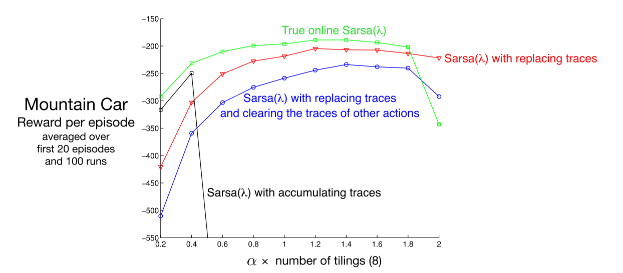 这一节 true online TD(\(\lambda\)) 使用的 eligibility trace 称为『dutch trace』,之前的 TD(\(\lambda\)) 中则称为『accumulating trace』。