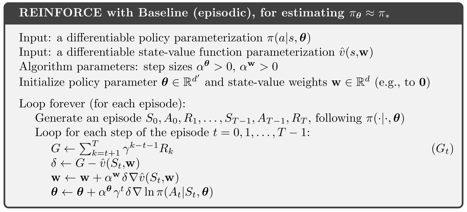 加入 baseline 不会对期望有任何影响,但能够减小方差。常用的选择是将 \(\hat{v}\left(S_{t}, \mathbf{w}\right)\) 作为 baseline ,好处是无需做别的计算,利用现有的量就能同时更新 \(\boldsymbol \theta\) 和 \(\boldsymbol w\) 。具体算法如下:
