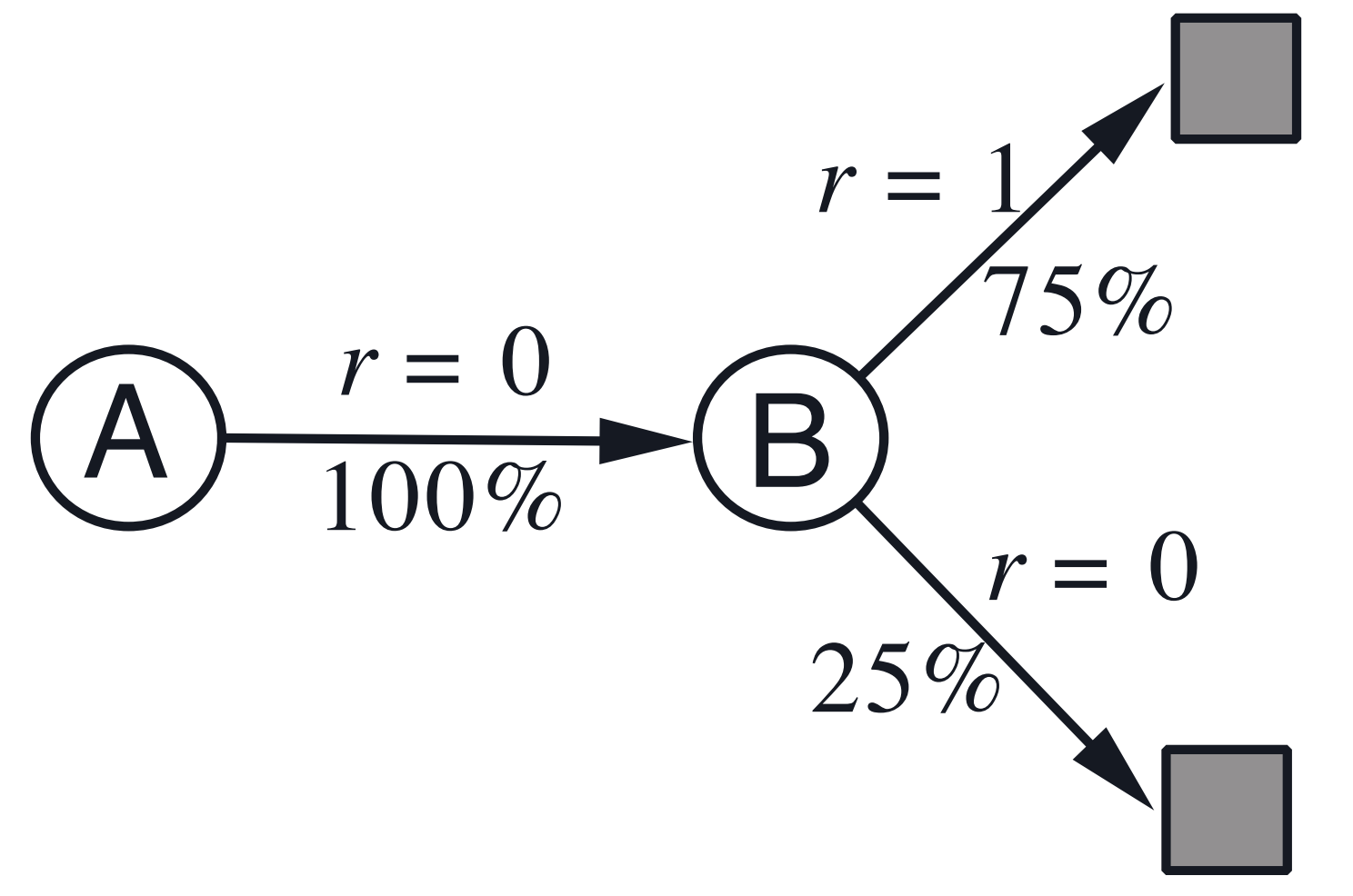 很显然,可以看出 \(V(B)=\frac{3}{4}\) ,而 \(V(A)\) 则有两种答案,在 TD 方法下 \(V(A)=\frac{3}{4}\) ,而对于 MC ,\(V(A)=0\) 。为什么会发生这样的情况呢?我们先来按照两种方法模拟计算一下: