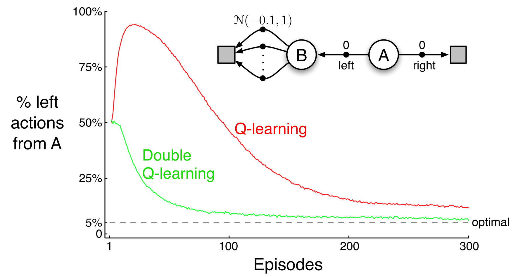 前面提到的许多算法都含有最大化的操作,通过这些最大化操作来逐步构建出最优策略,比如 Q-learning 中有 \(\max\limits_a Q(S_{t+1},a)\) 、Sarsa 中也常有 \(\varepsilon\)-greedy 策略,同样包含最大化操作。这些最大化操作常常会造成显著的正偏差。