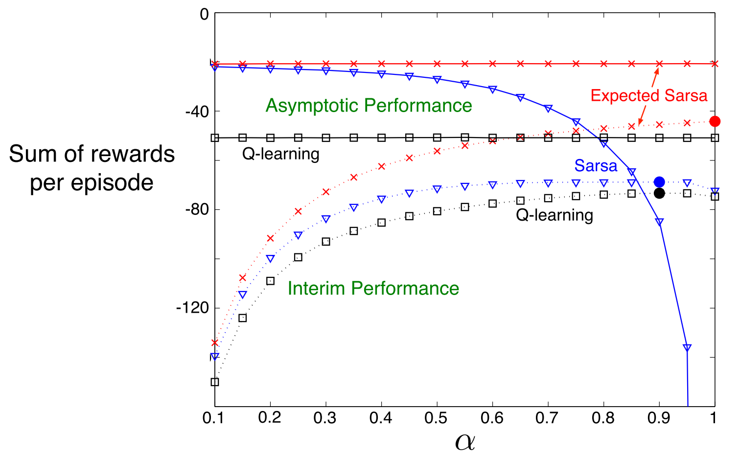 从图中可以看出,即使 \(\alpha=1\) ,Expected Sarsa 也一样能够收敛(此时其形式很接近 DP ),而 Sarsa 则只能在 \(\alpha\) 较小时才有好的表现。
