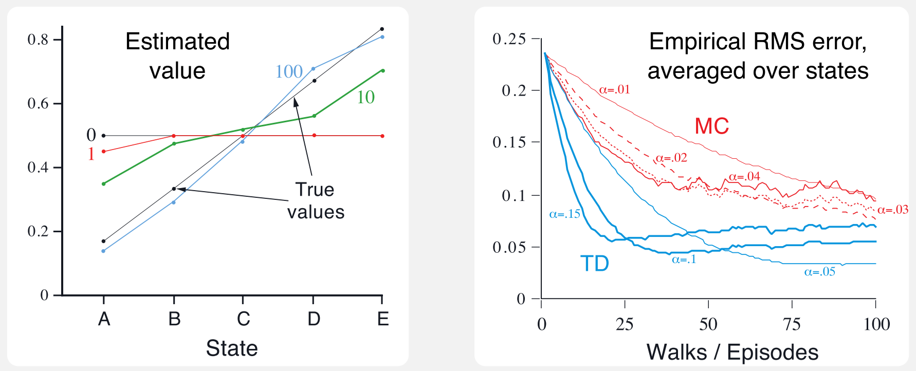 - 右图对比了两种算法在不同 \(\alpha\) 取值下的误差收敛曲线。可以看出,至少在该例中,TD 方法确实要优于 MC 方法。