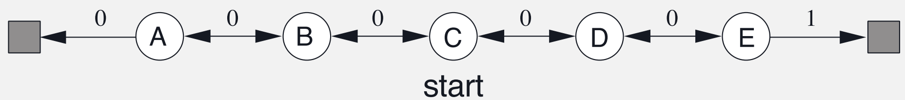 问题的背景就是从中间结点 C 出发,若能达到右边的终止态,返回奖励值 1,其余情况均返回奖励值 0。我们用 \(P_i\) 来表示当我们处于状态 i 下,最终能到达右终止态的概率,易知