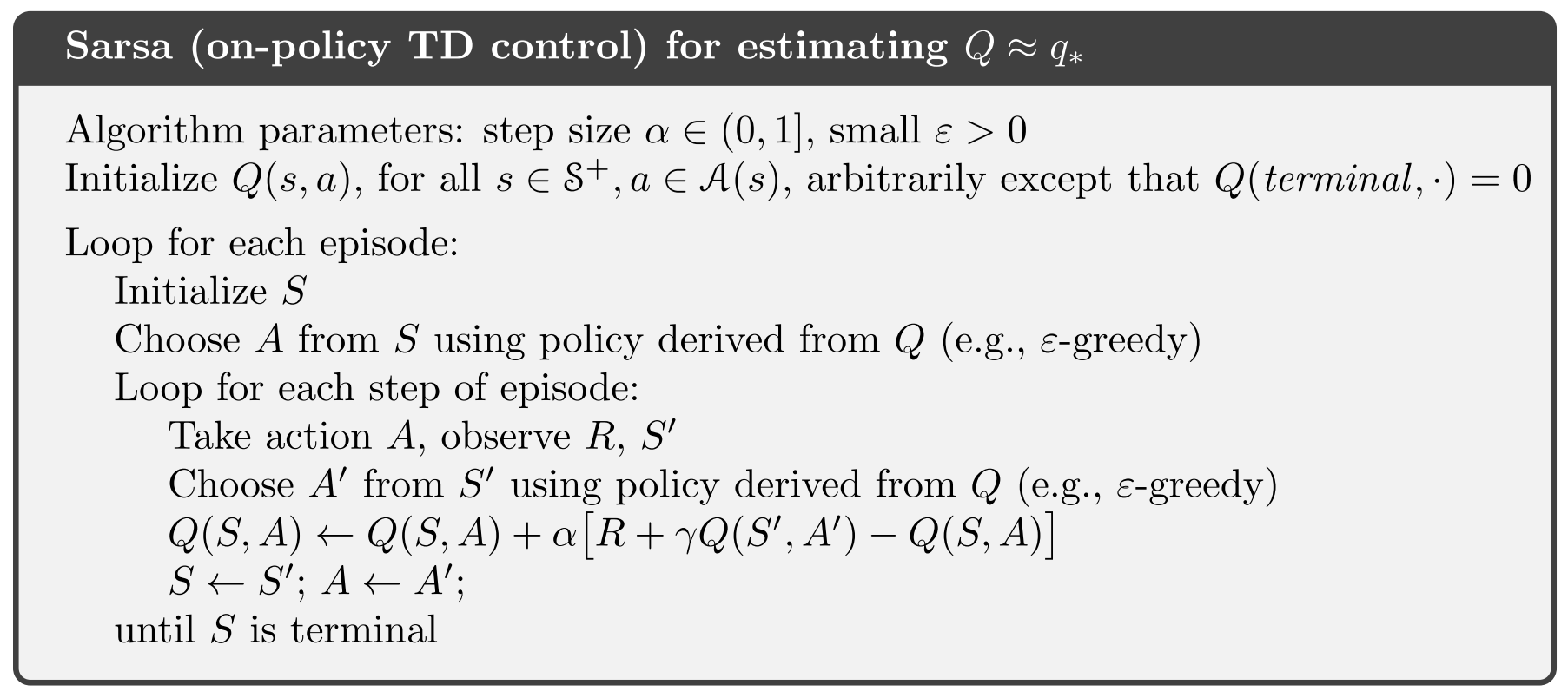 - 显然,Sarsa 是 On-policy 的算法,且和 MC 相似,需要确保各状态都被访问足够多次数才能收敛,因此一般都用于 \(\varepsilon\)-greedy 或 \(\varepsilon\)-soft 策略。