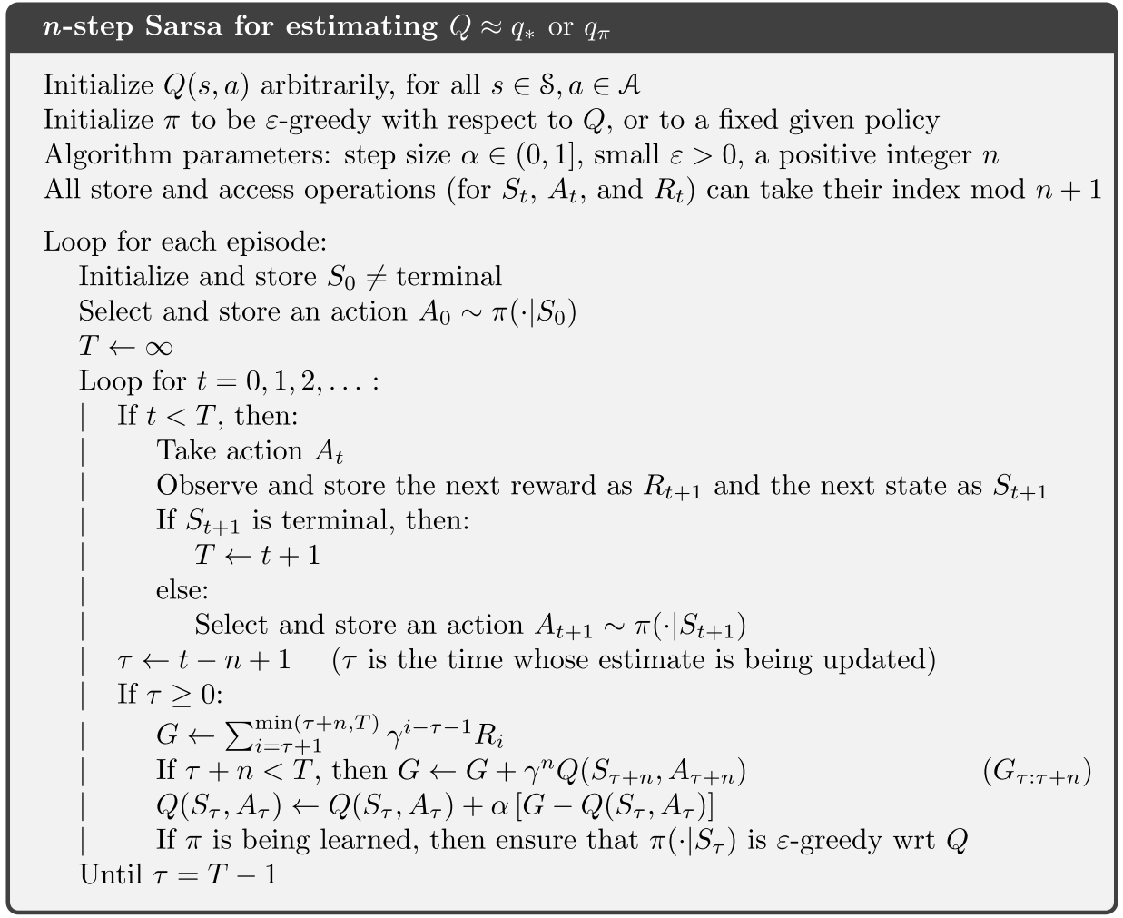 \[ Q_{t+n}(S_t,A_t)\doteq Q_{t+n-1}(S_t,A_t)+\alpha[\color{red}{G_{t:t+n}}-\color{blue}{Q_{t+n-1}(S_t,A_t)}] \]