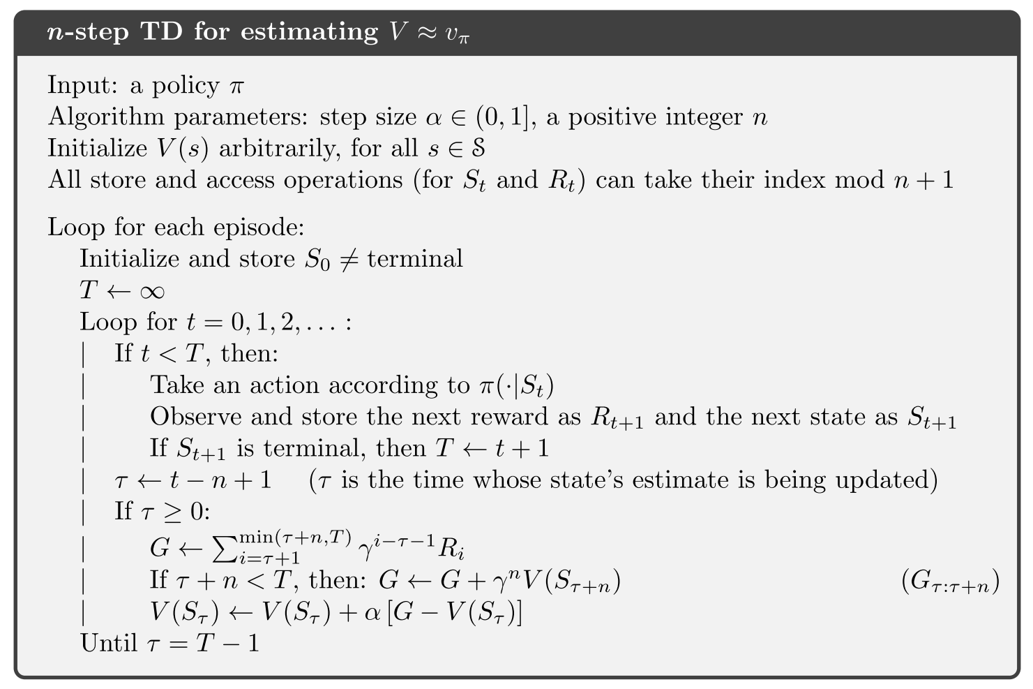 \[ G_{t:t+n}\doteq \color{red}{R_{t+1}+\gamma R_{t+2}+\cdots+\gamma^{n-1}R_{t+n}}+\color{blue}{\gamma^n\bar{V}_{t+n-1}(S_{t+n})} \]
