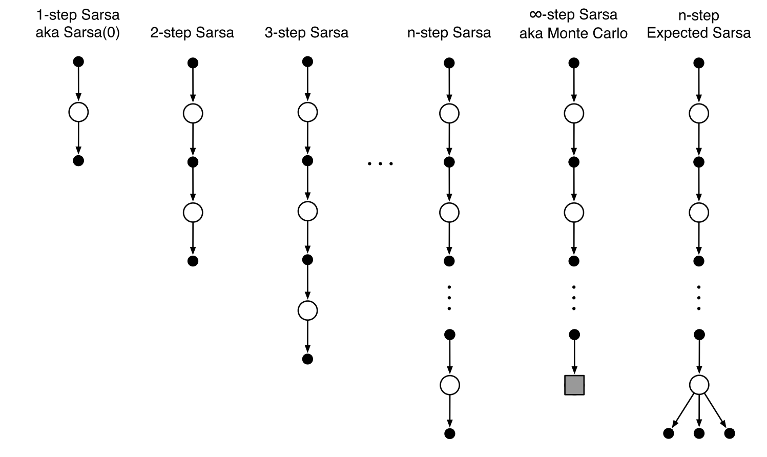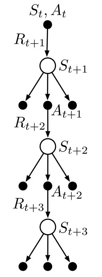 离线学习是否可以不引入一个新的 behavior 策略呢?上一章讲 Q-learning 时已经提过,先作整体估计再采取行动的方法,其实就可以看作离线学习策略,而这一章更广义地将这类方法定义为“n-步树回溯法”,即在每步行动前,对所有分支进行整体估计然后做更新,更新之后再采取一个具体行动,这个算法的示意图如下图所示
