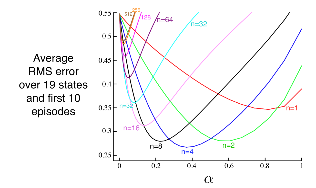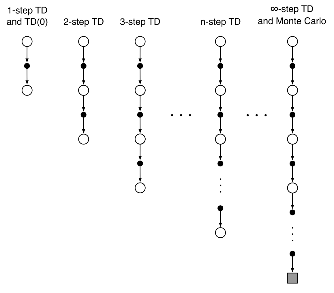 从上图可以看出,第六章的方法是 1-step TD ,第五章的 MC 方法则可看作 \(\infty\)-step TD 。
