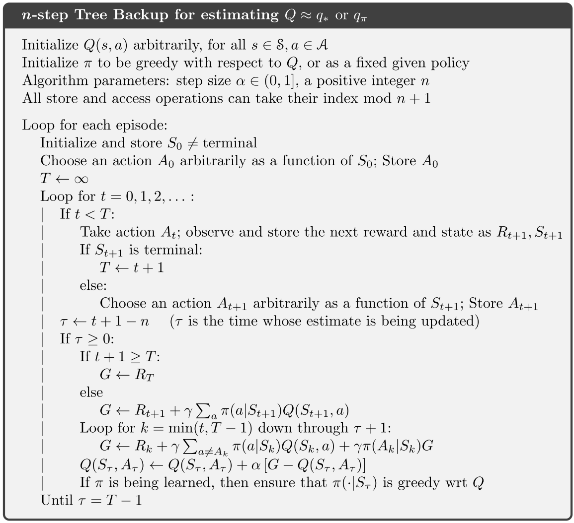 \[ \begin{aligned} G_{t:t+1}&\doteq R_{t+1}+\gamma \sum_a\pi(a|S_{t+1})Q_t(S_{t+1},a)\\ G_{t:t+2}&\doteq R_{t+1}+\gamma \sum_{a\neq A_{t+1}}\pi(a|S_{t+1})Q_t(S_{t+1},a)\\ &+\gamma \pi(A_{t+1}|S_{t+1})\left(R_{t+2}+\gamma \sum_a\pi(a|S_{t+2})Q_{t+1}(S_{t+2},a)\right)\\ &=R_{t+1}+\gamma\sum_{a\neq A_{t+1}}\pi(a|S_{t+1})Q_{t+1}(S_{t+1},a)\\ &+\gamma\pi(A_{t+1}|S_{t+1})G_{t+1:t+2}\\ \vdots\\ G_{t:t+n}&\doteq R_{t+1}+\gamma\sum_{a\neq A_{t+1}}\pi(a|S_{t+1})Q_{t+n-1}(S_{t+1},a)\\ &+\gamma\pi(A_{t+1}|S_{t+1})G_{t+1:t+n}\\ \end{aligned} \]
