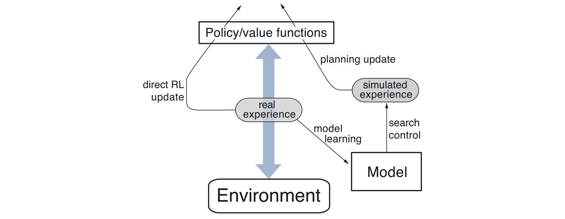 - 中间的 real experience 是算法的核心要素,通过与环境交互获得。