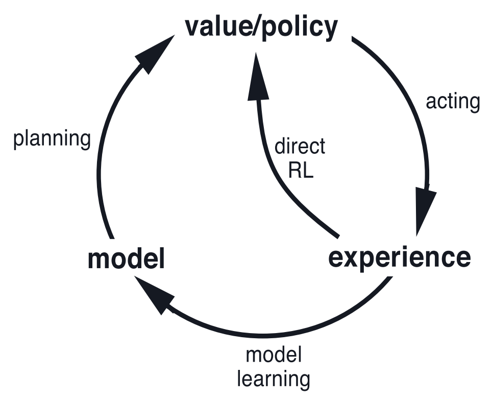 - 『真实经验』:用于改进模型,使模型和真实环境更加匹配;也能用于直接改进价值函数和策略(比如 MC 方法)。