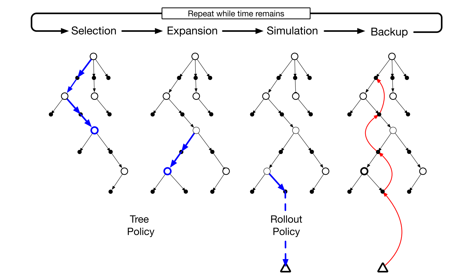 - 模拟:从当前叶节点开始,根据 rollout 策略执行动作直到终止时间。