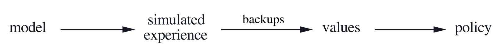 - 向右下的箭头表示 indirect RL 过程。先由真实经验数据改善 model ,再由 model 产生模拟经验数据,进而去更新 value function 和 policy 。