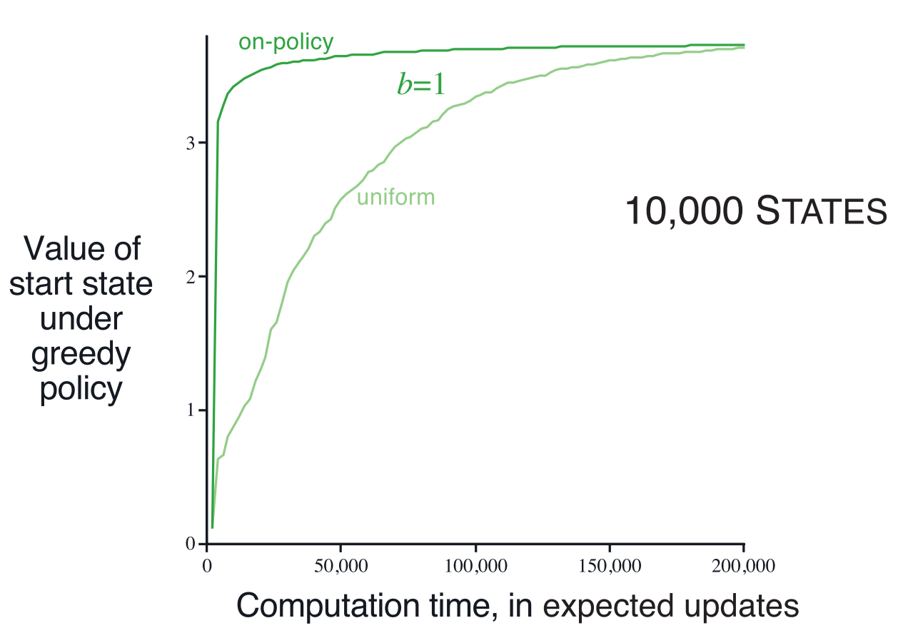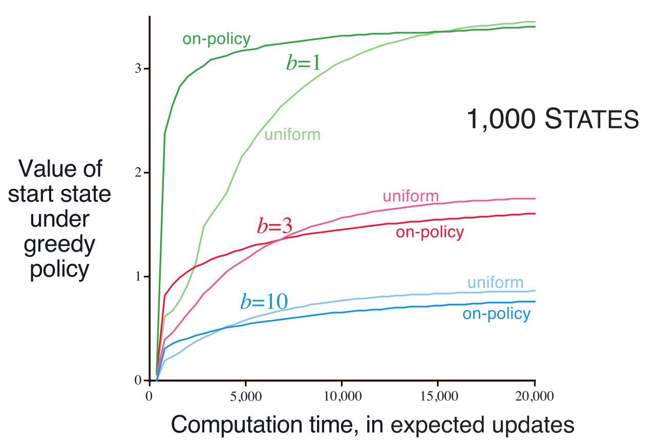 下面看一组对比 Trajectory Sampling 与 Uniform Sampling 的效率对比实验。实验中统一使用 expected updates: $$ Q(s,a)\leftarrow \sum_{s'}\hat{p}(s'|s,a)[\hat{r}(s,a,s')+\gamma \max_{a'}Q(s',a')] $$