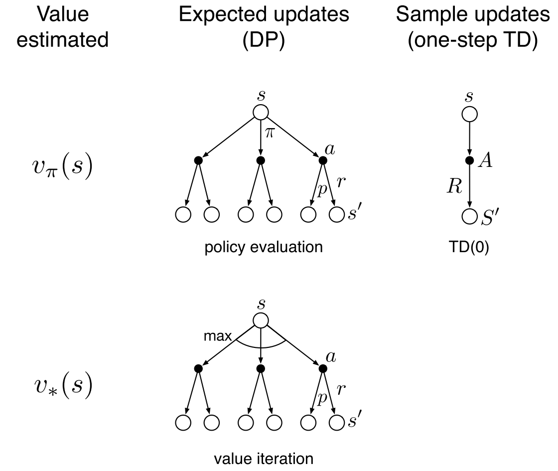 则 expected updates 的更新式为 $$ Q(s,a)\leftarrow \sum_{s'}\hat{p}(s'|s,a)[\hat{r}(s,a,s')+\gamma \max_{a'}Q(s',a')] $$ sample updates 的更新式为 $$ Q(s,a)\leftarrow Q(s,a)+\alpha[\hat{r}(s,a,s')+\gamma \max_{a'}Q(S',a')-Q(s,a)] $$
