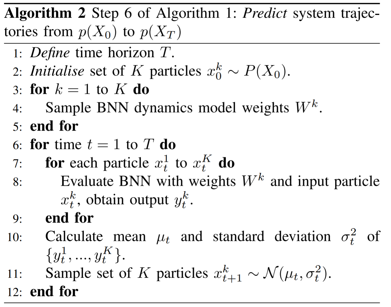 create P particles from the current state, \(s_{t=0}^p=s_0 \forall p\),每个particle都服从分布进行传播:\(\boldsymbol{s}_{t+1}^{p} \sim \widetilde{f}_{\boldsymbol{\theta}_{b(p, t)}}\left(\boldsymbol{s}_{t}^{p}, \boldsymbol{a}_{t}\right)\),其中particle的选择是基于一个bootstrap \(b(p,t)\in\{1,\ldots,B\}\),最终将P组Particles采集到的结果进行ensemble。