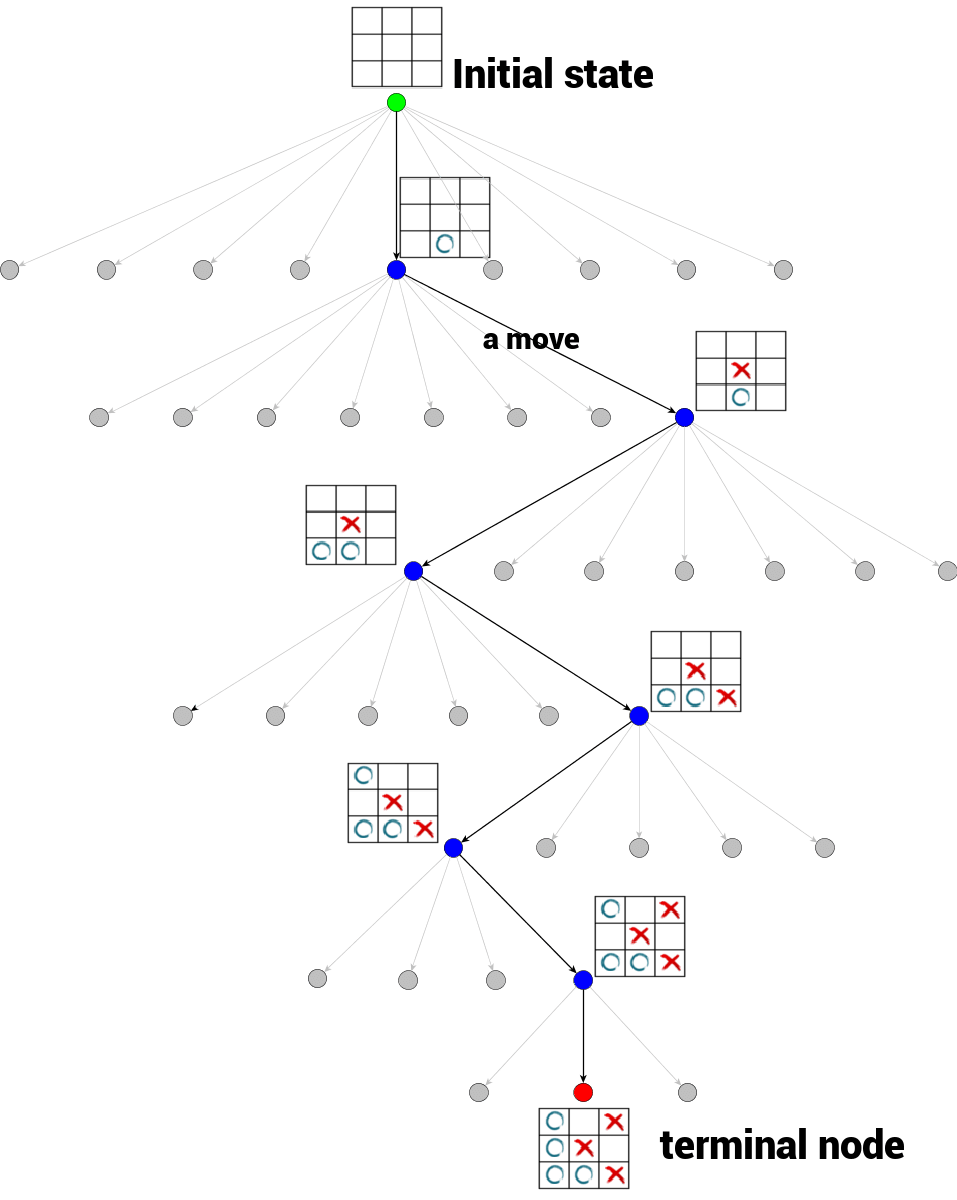 - move 是一个函数,它在给定当前状态 \(s_i\) 和在该状态的动作 \(a_i\) 下,生成下一个博弈状态(当前节点的子节点之一)