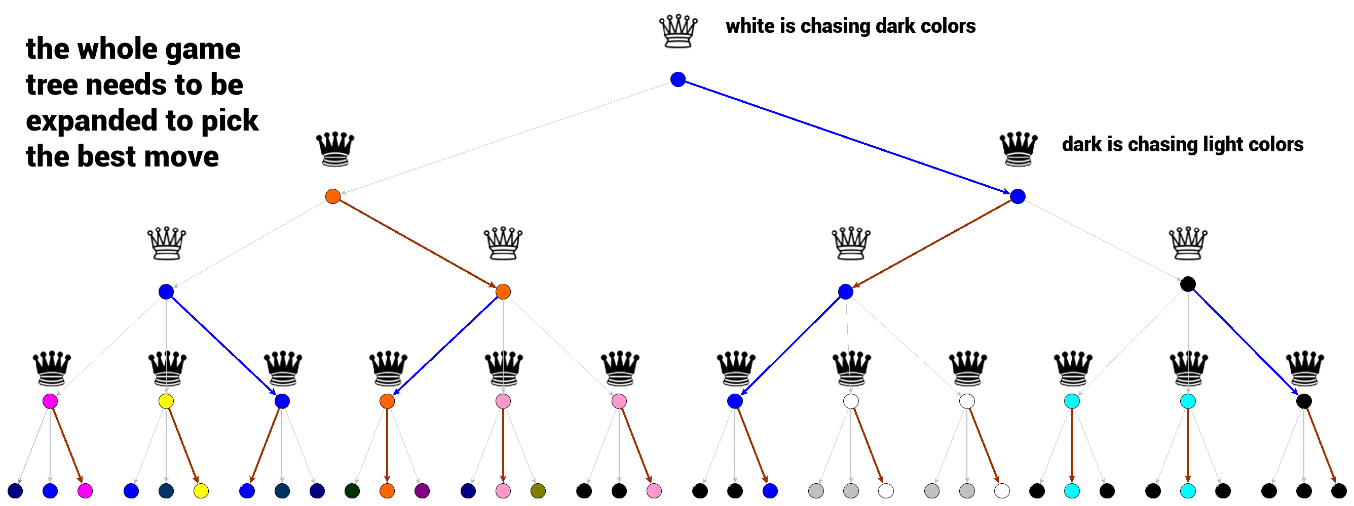 每一个层级的选择都是极小极大判断的最优结果。我们可以从底部的终端节点开始,其中的选择是很明显的。黑棋将总是选择最明亮的颜色,然后白棋将寻找最大的奖励并选择到达最暗颜色的路径。
