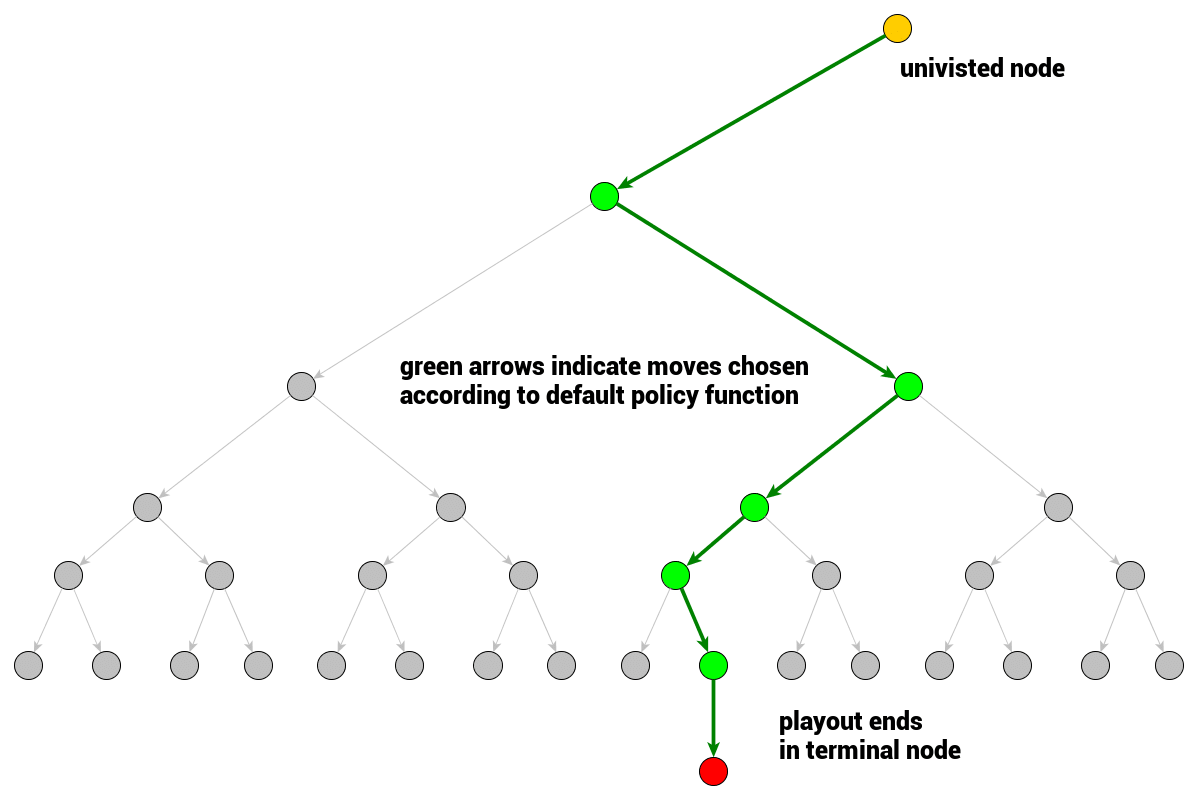 该函数将输入一个博弈状态,并产生下一次行动的选择。在实践中,该函数会设计为允许很多次模拟快速进行,一般默认的 rollout 策略函数可以是服从均匀分布的随机采样。