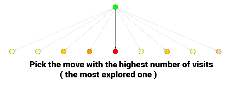 一旦 MCTS 过程结束,最好的一步通常是具备最高访问量 \(N(v_i)\) 的一步,因为它的奖励值评估结果最好(评估值必然很高,因为它被探索的频率最高)。