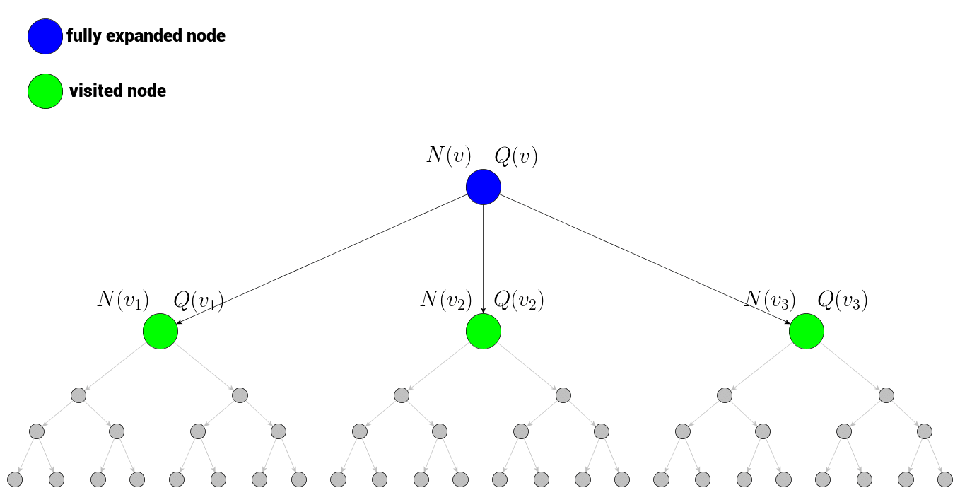 当前节点(蓝色)是完全展开的,因此它必须经过访问,以存储节点数据:它及其子节点的总模拟奖励和总访问次数。这些值是为了最后一部分:树的置信上限(UCT)做准备。