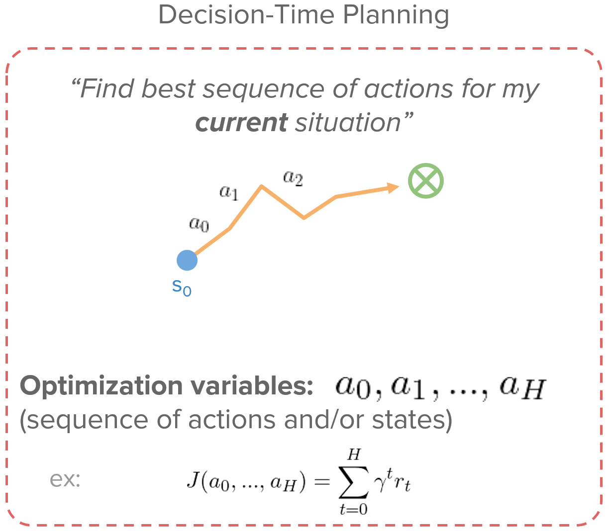 而decision-time planning的return为\(J(a_0,\ldots,a_H) = \sum_{t=0}^{H} \gamma^{t} r_{t}\),能够更快速地对当前状态做rollout,因此其特点为『专注学习当前状态下如何更好地表现』