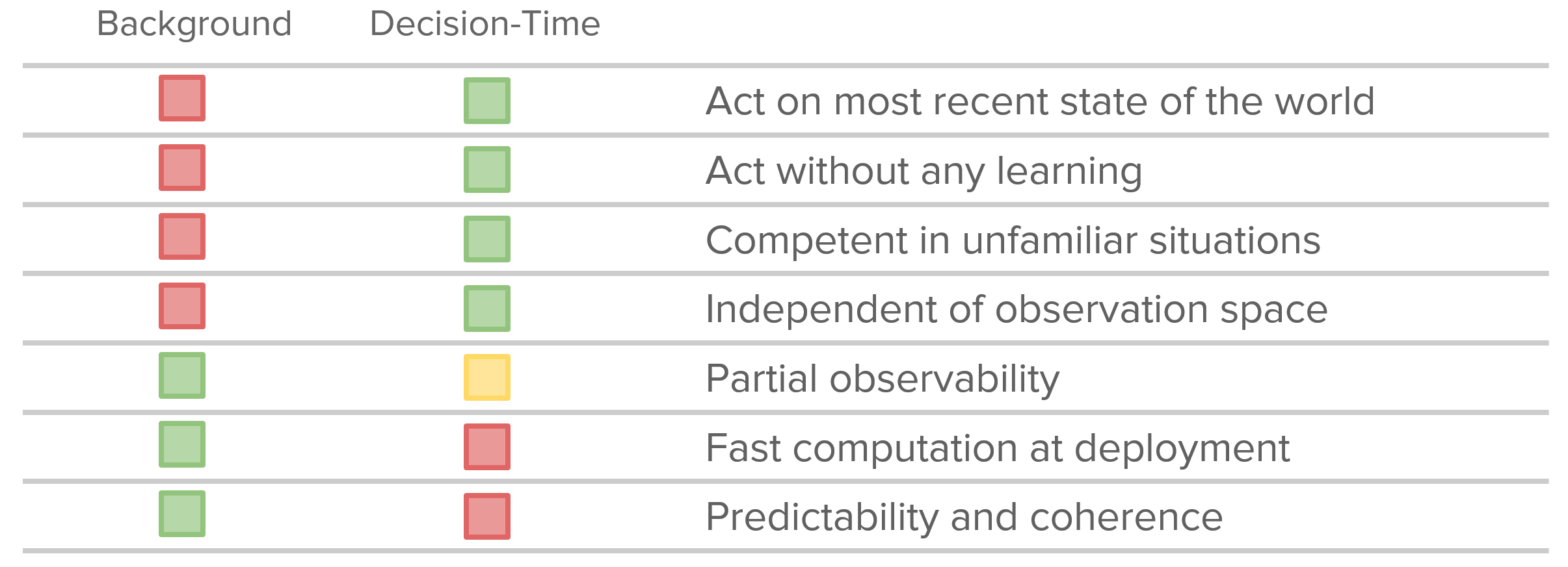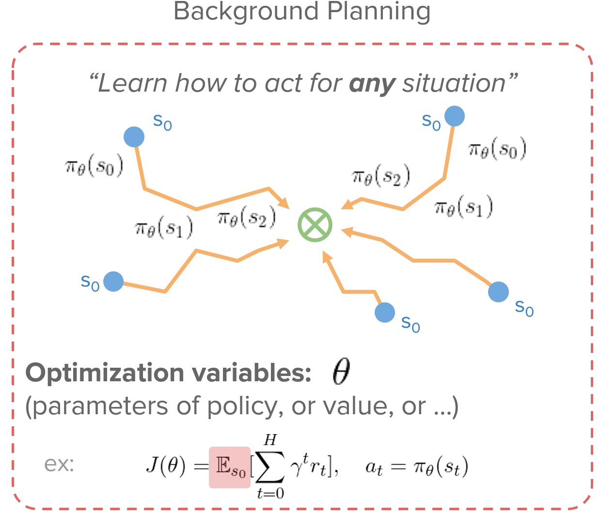 可以看出,background planning能够通过求期望来更全面地考虑不同初始状态\(s_0\),所以其特点是『学习在任意情况下如何更好地表现』,通用性更好