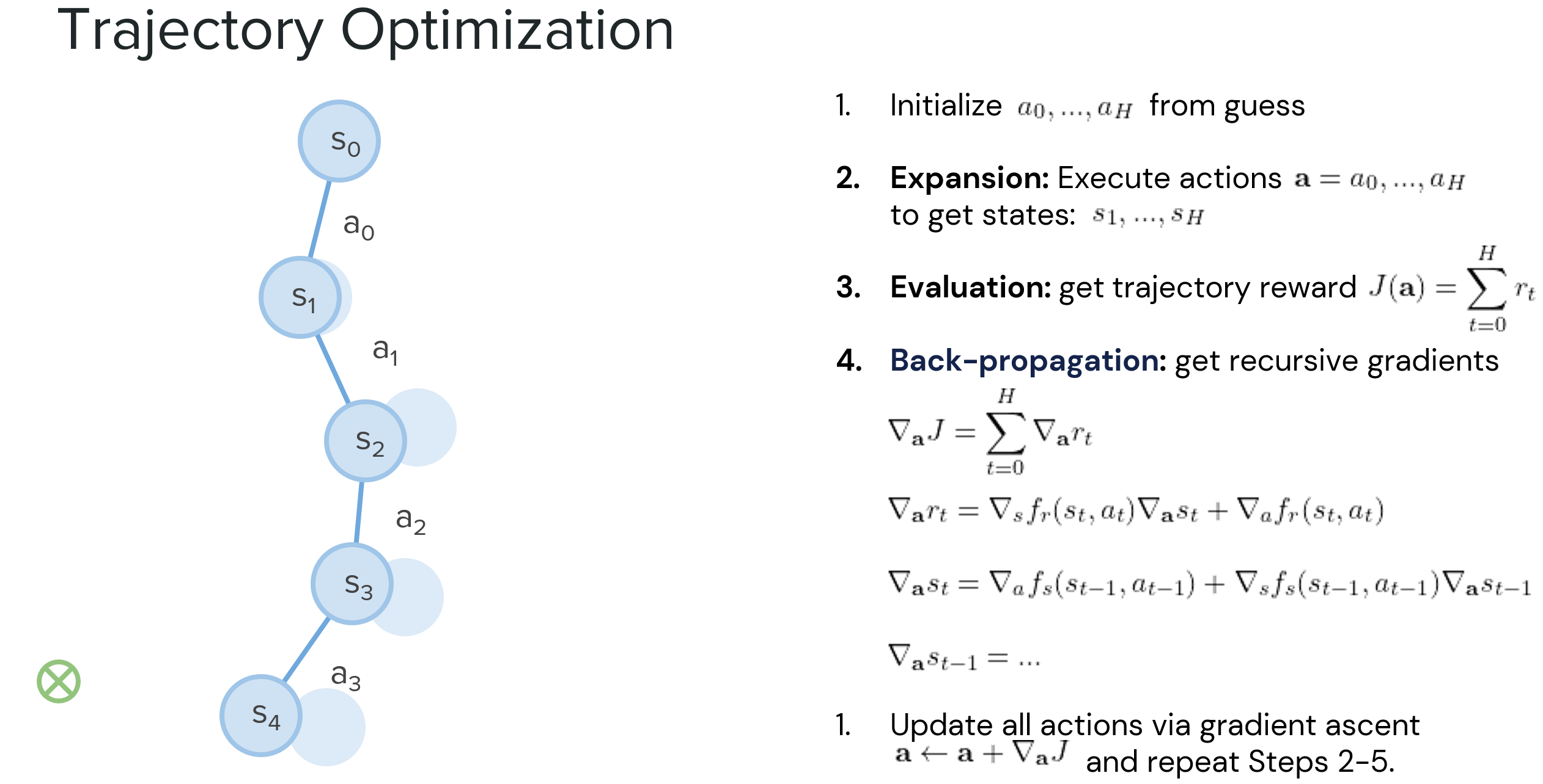 连续型场景下,主要是通过计算梯度的方法来更新action \(\boldsymbol{a}\),从而使得trajectory逐渐靠近最优解。