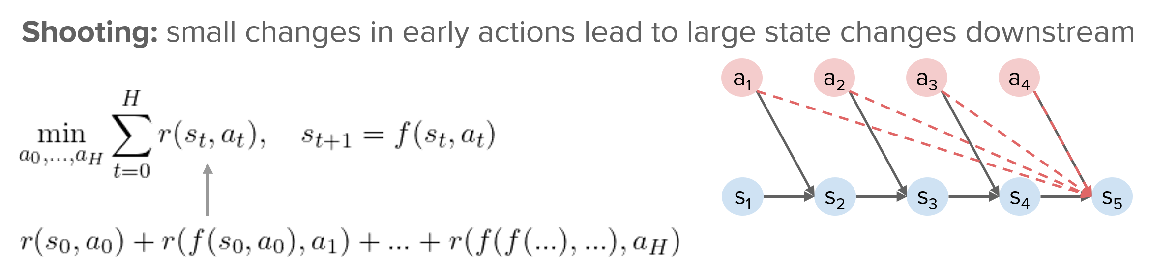 在shooting算法中,如下图所示,后续的状态对前面每一时刻的状态&动作都有依赖关系