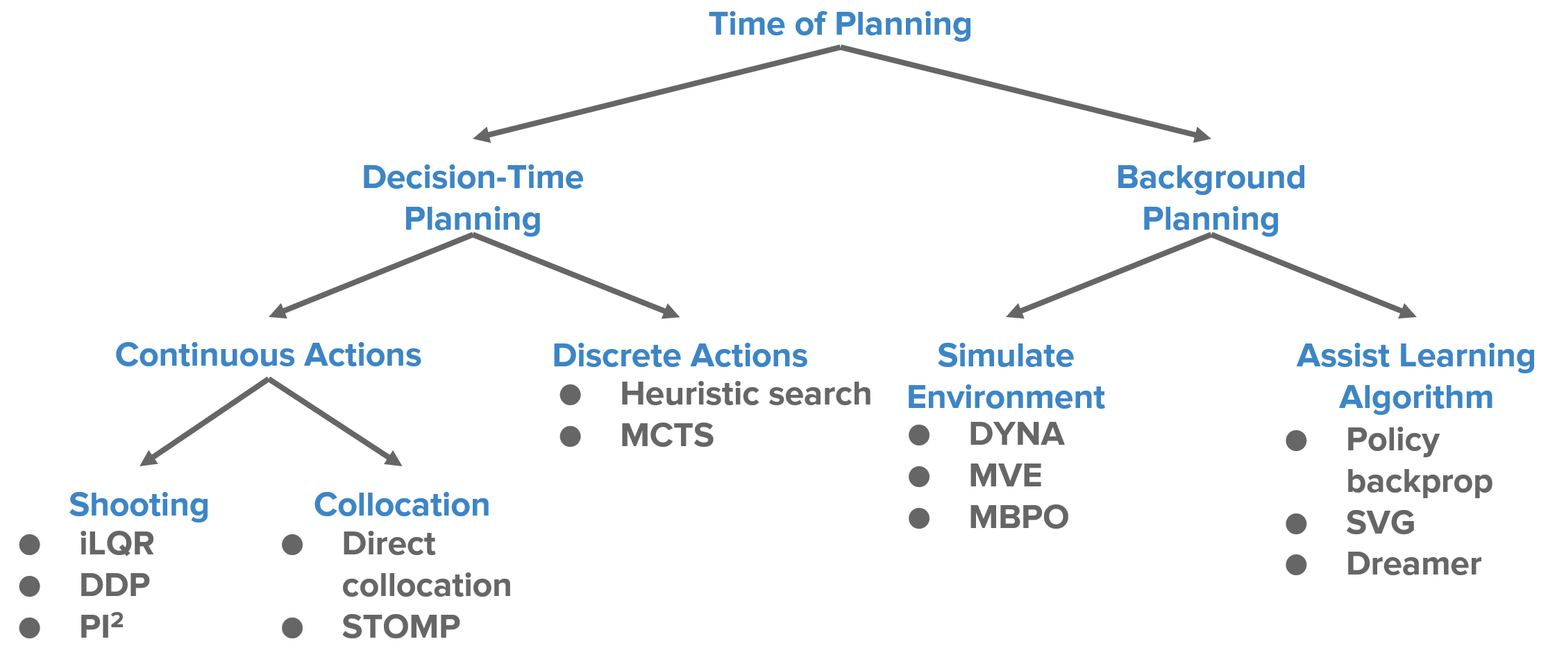 Decision-time planning分为离散型和连续型两种场景,前者的代表便是大名鼎鼎的蒙特卡洛树搜索(MCTS),后者则包含能够解决不同场景问题的具体方法。