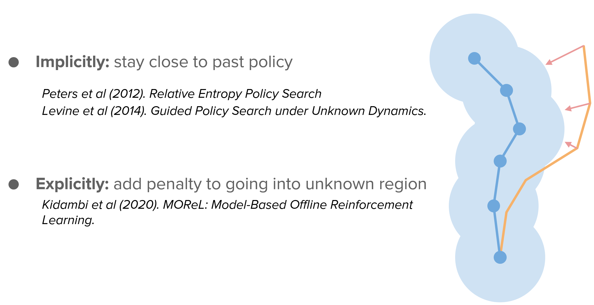 还有一种方法,通过添加惩罚项(显式)或者一些熵函数(隐式)的方法,诱导planner尽量只在model certain区域做planning,也能规避掉因model uncertainty带来的error。