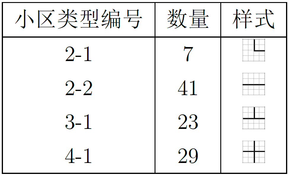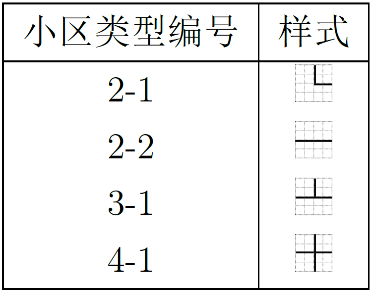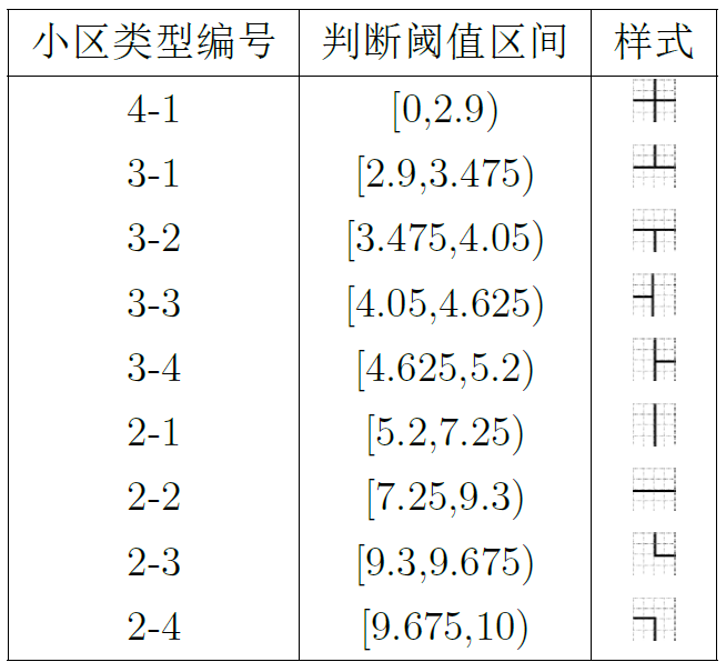 其中,在确保能够在后续操作中消除偏差的前提下,根据拓扑学将小区类型抽象为四个类型,具体的分类统计表格如下(不同方向的同结构小区按一类计):