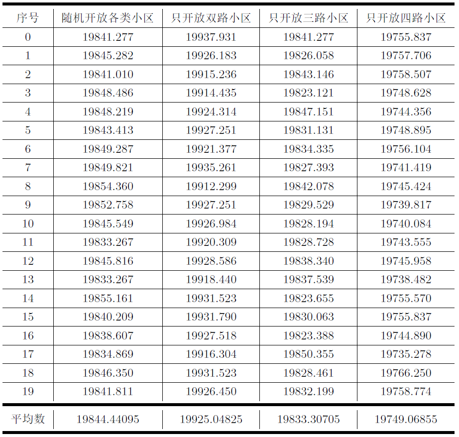 下面是在分别开放不同类型结构小区的情况下,道路节点拥堵指标的统计结果: