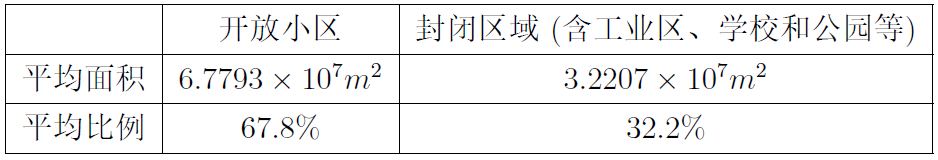 通过对卫星地图数据的采集,实际统计了5块等大小的\(10000\times 10000m^2\)的小区群落区块,采用网格技术统计法统计开放小区的占有比例。