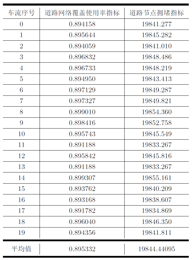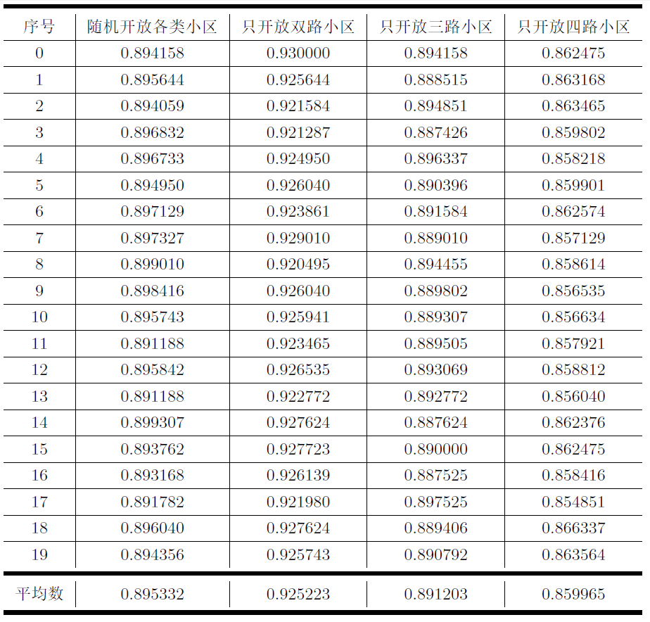 在统计结果中,道路网络覆盖使用率指标下的平均值0.895332是指在该结构下,小区群的开放能够让周围的主干道路使用率降为原来的89.5332%,这个值越低,则能说明该结构的开放小区群能够更大程度地减弱周围道路的运行压力,增强主干道路的通车能力。