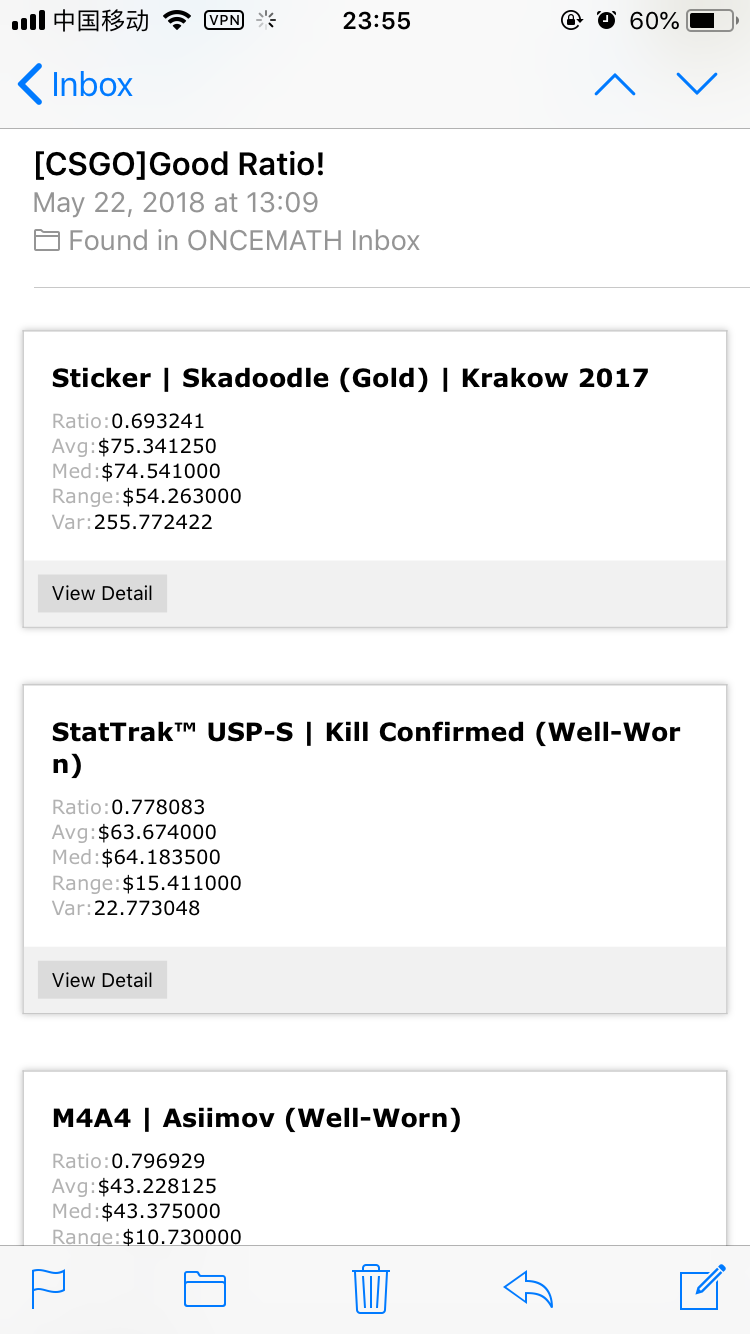 同时,爬虫也具备邮件发送的功能,可以在服务端设置好参数,爬虫能够根据用户设置好的条件,将优秀的饰品信息推送给用户,即使出门在外也能随时通过手机收取比例信息。